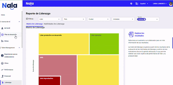 En caso que la empresa cuente con resultados de performance y clima de los equipos, se activará también la matriz de liderazgo, tal como se muestra en la imagen 🎊