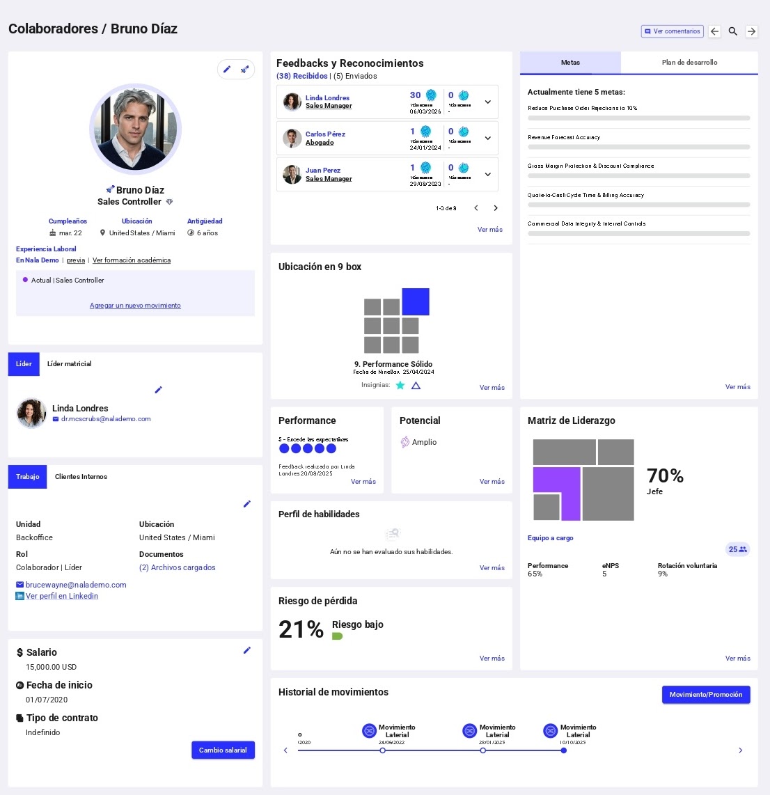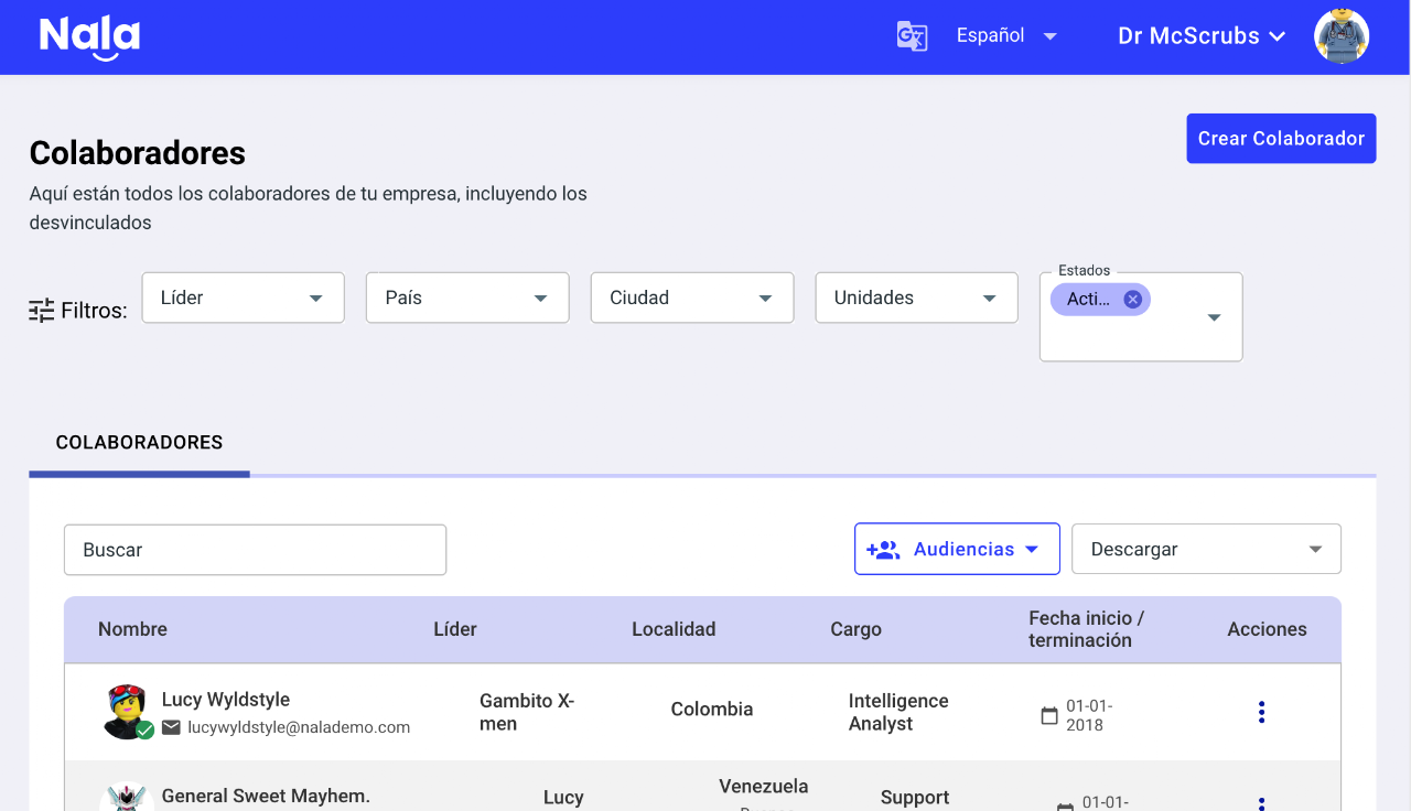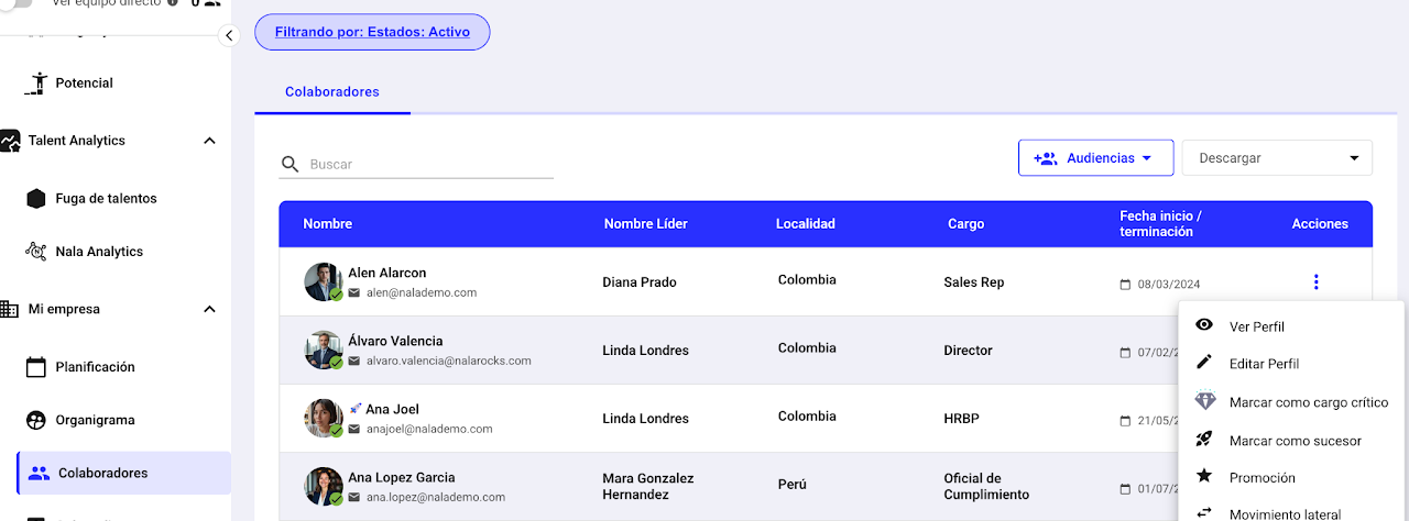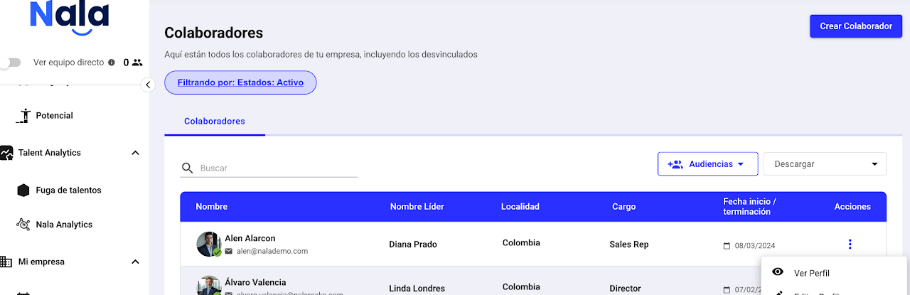 Incluye los datos de los colaboradores cargados en Nala (nombre, cargo, unidad, líder, fecha de ingreso, entre otros campos disponibles).