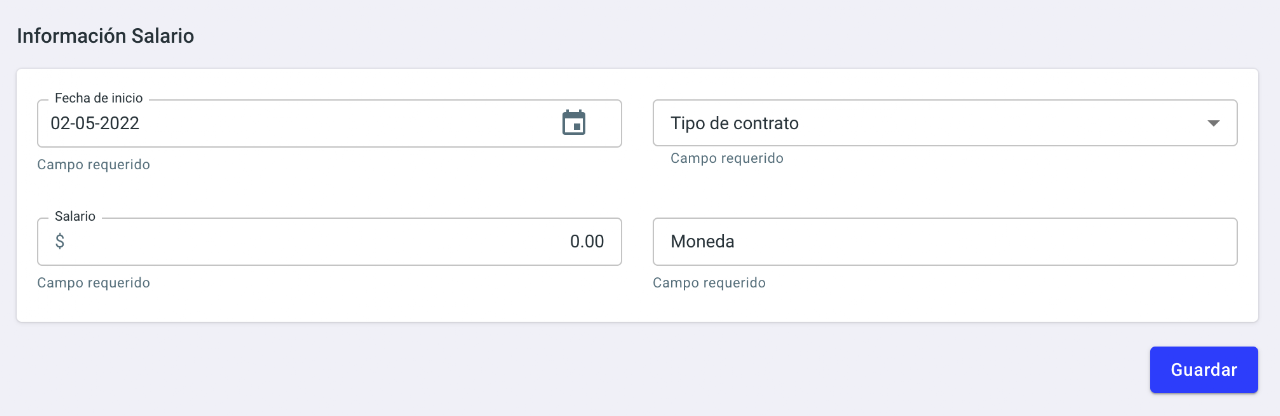 Finalmente, confirma la fecha de inicio de contrato, tipo de contrato, valor del salario y moneda en la que se pagará.