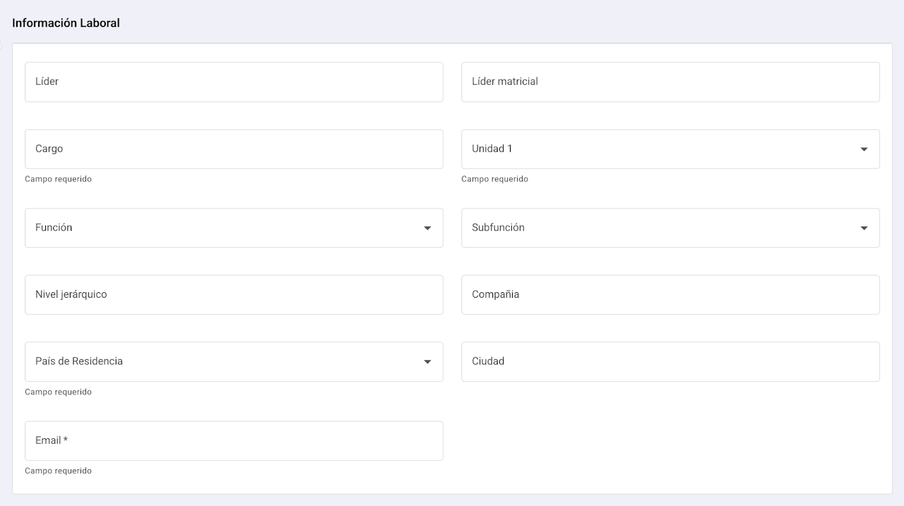 Continúa a la sección de información laboral, indicando líder, cargo, departamento, área, nivel jerárquico y compañía.