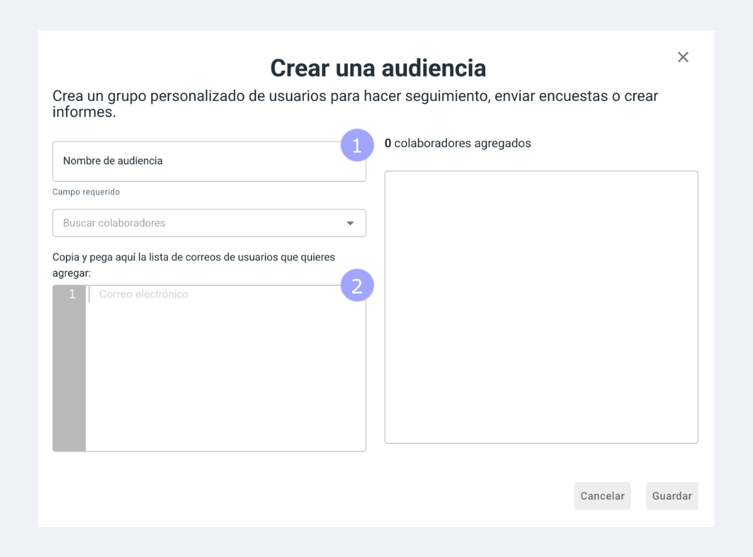 Las audiencias te permiten agrupar colaboradores según criterios específicos, como cargo, nivel jerárquico o cualquier otra categoría relevante y con ello puedes enviar encuestas, evaluaciones o comunicaciones a grupos específicos.