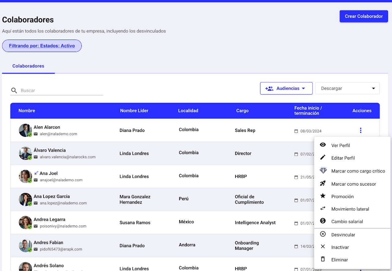 Entra al módulo de colaboradores y abre el perfil del colaborador desde acciones. Aquí podrás: