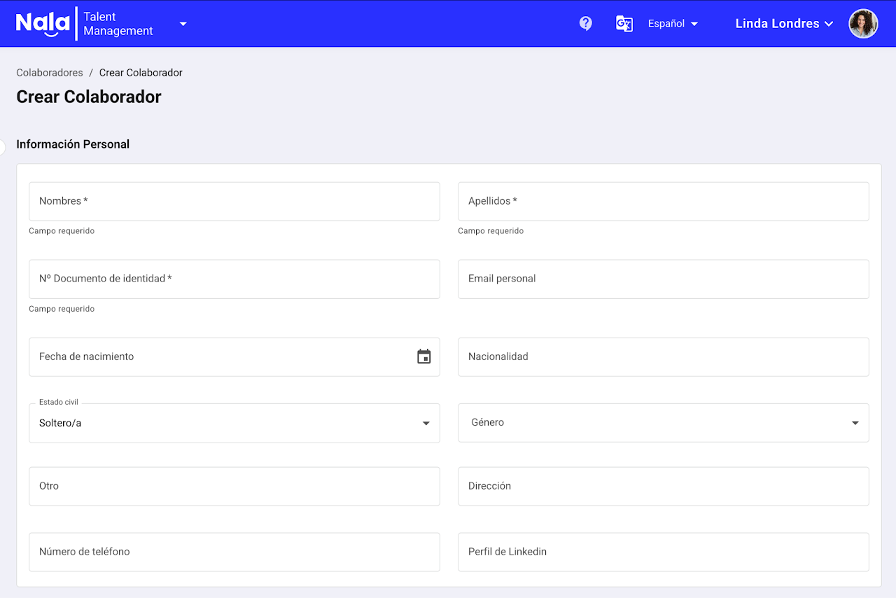 Para comenzar haz clic en el botón "crear colaborador" y luego comienza a completar la información que Nala solicitará.