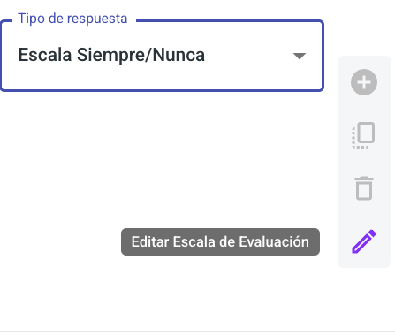 Al personalizar un formulario, en una sección de preguntas cerradas, define el tipo de escala y selecciona el icono de lápiz que aparece al posicionar el mouse sobre el campo "Tipo de respuesta"