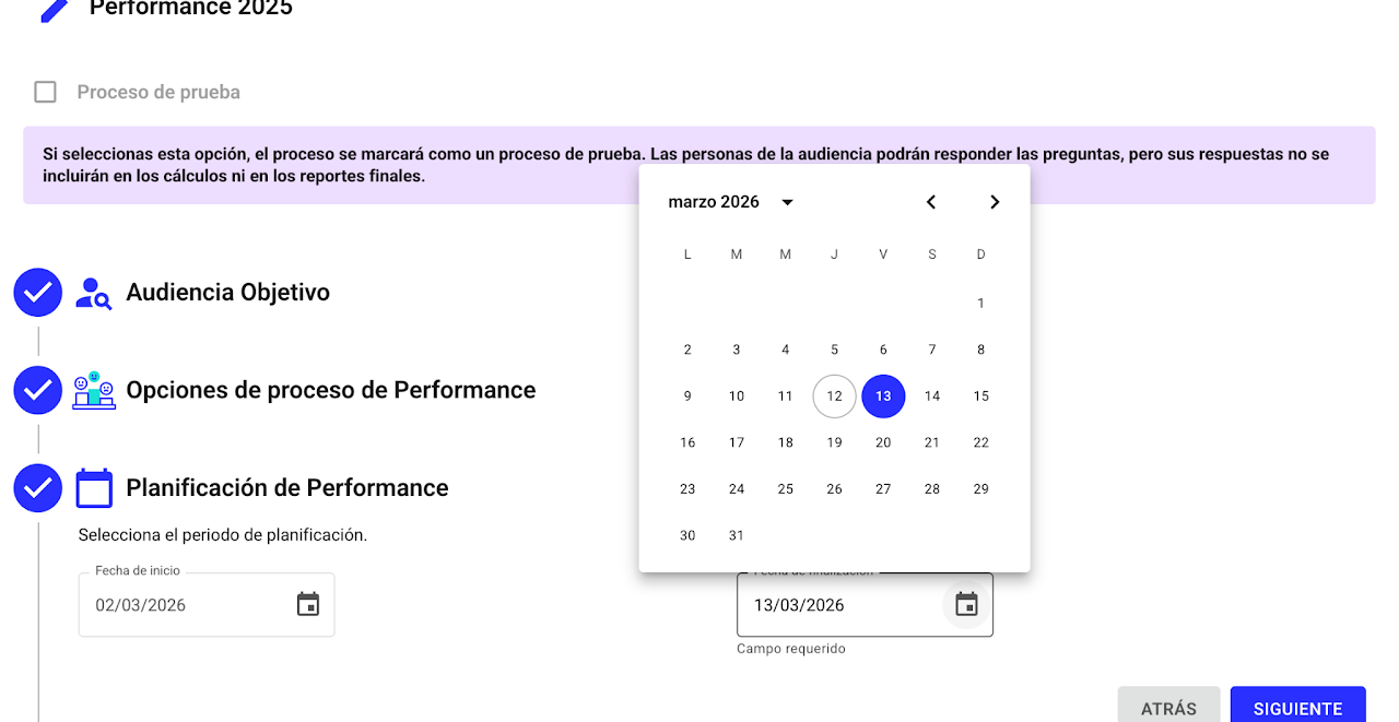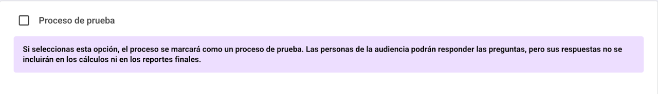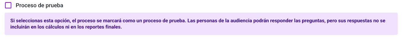 Si necesitas hacer una prueba antes de lanzar una evaluación real, marca el proceso como "Proceso de prueba". Esto te permitirá ajustar el proceso en medio de la evaluación sin afectar los resultados. Estos, no aparecerán en los reportes de performance.