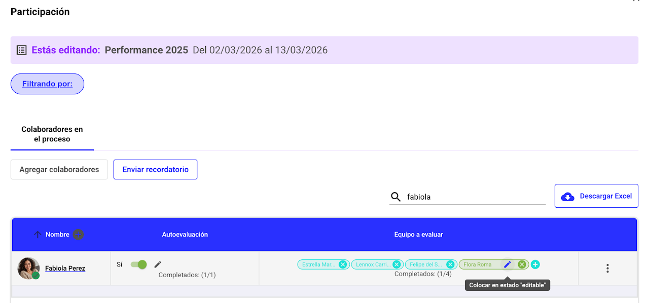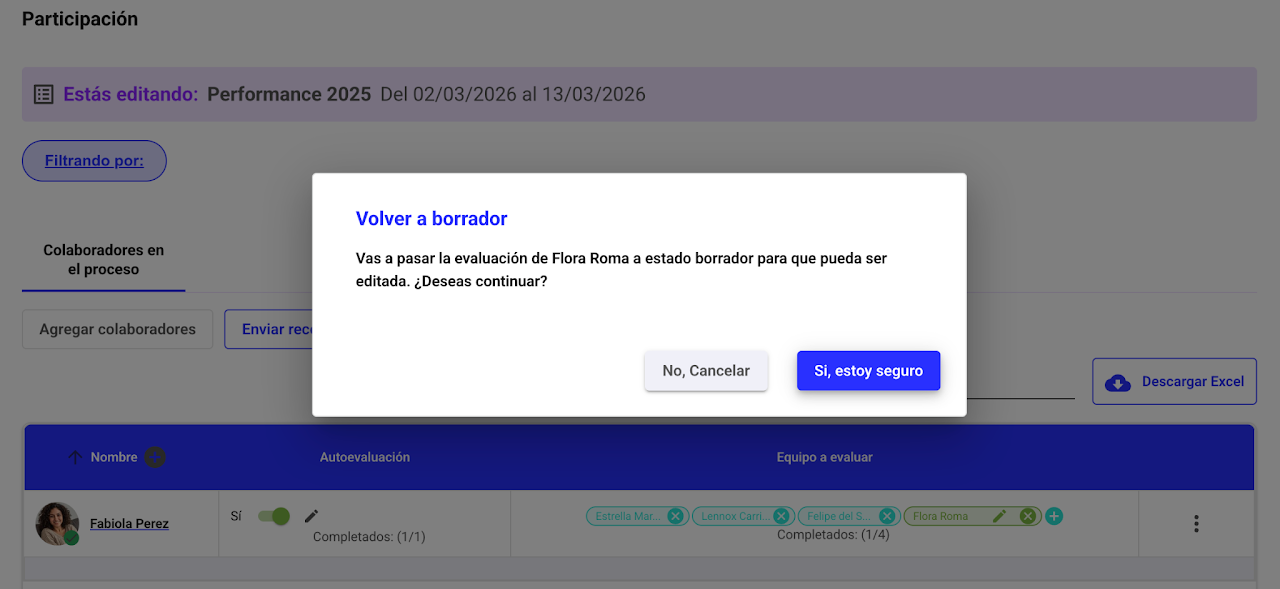 Para que un colaborador pueda volver a revisar o modificar sus respuestas, la evaluación debe estar en estado “En curso”.