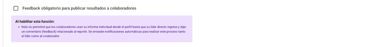 Si activas feedback, los resultados no serán visibles hasta que el colaborador confirme haber recibido su retroalimentación.