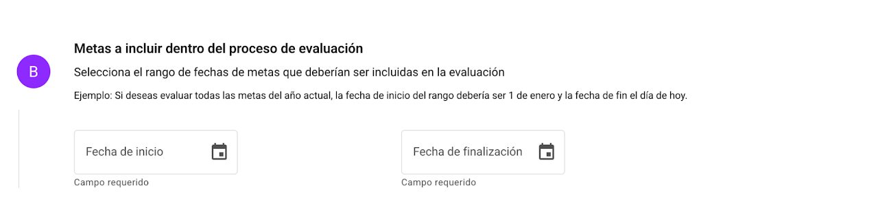 ❗ Importante: Si no defines bien este rango, la plataforma no traerá las metas correspondientes y no podrán ser evaluadas.