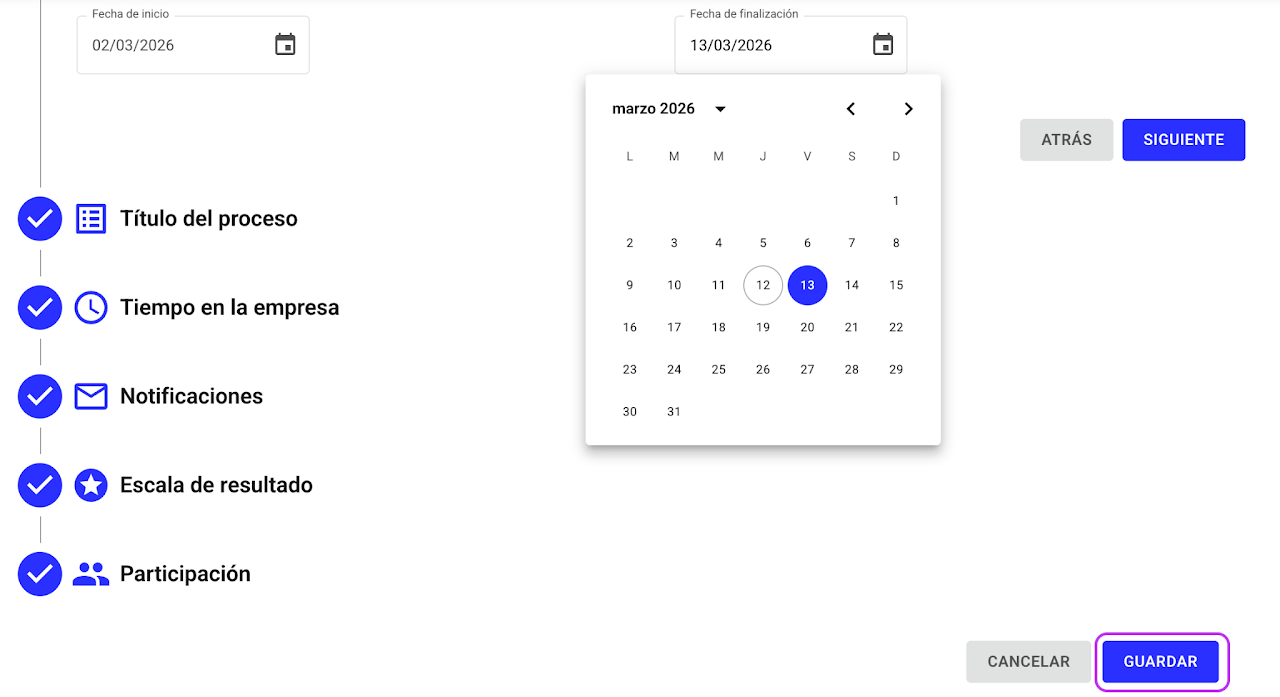 ⚠️ Importante: Una vez que programes un proceso de prueba, no podrás desactivarlo. Si decides hacer una evaluación formal, tendrás que crear un nuevo proceso.