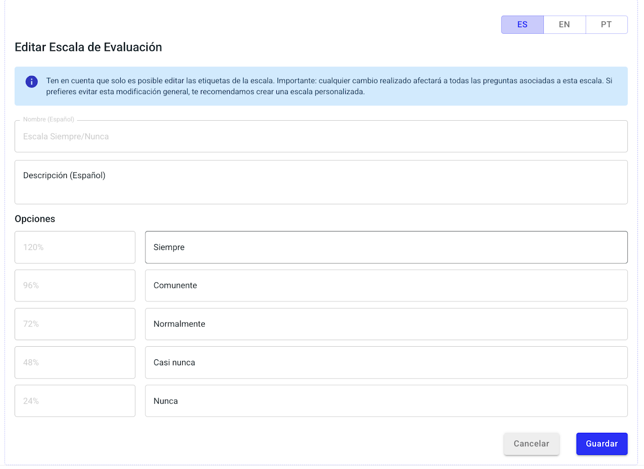 Cuando estés conforme, selecciona guardar. Este cambio se reflejará en todas las preguntas del formulario que tengan asociadas esta escala.