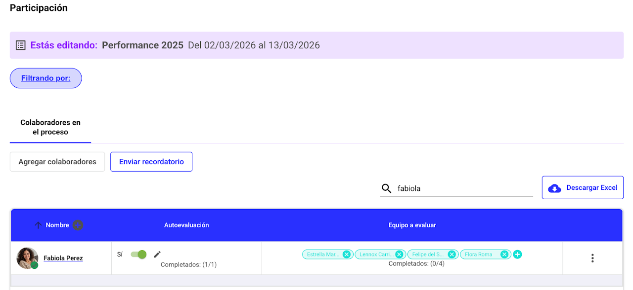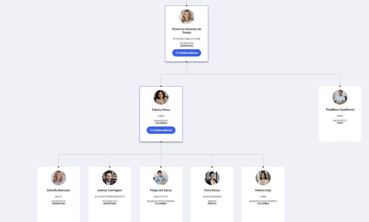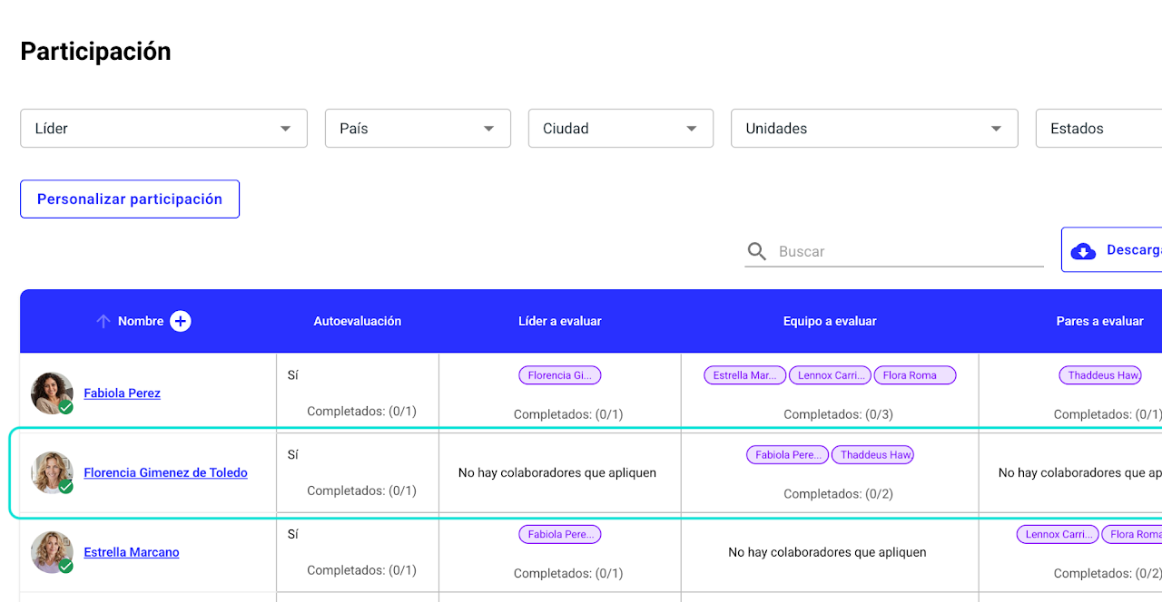 En este organigrama, Florencia Giménez de Toledo es líder de Fabiola y Thaddeus. A su vez, Fabiola lidera a Estrella, Lennox, Felipe, Flora y Helena.Al revisar la participación del proceso: