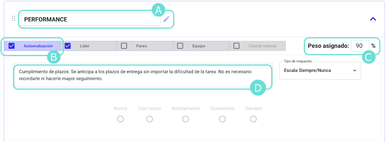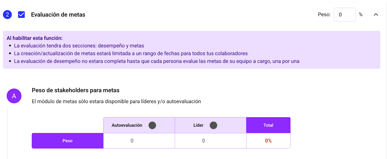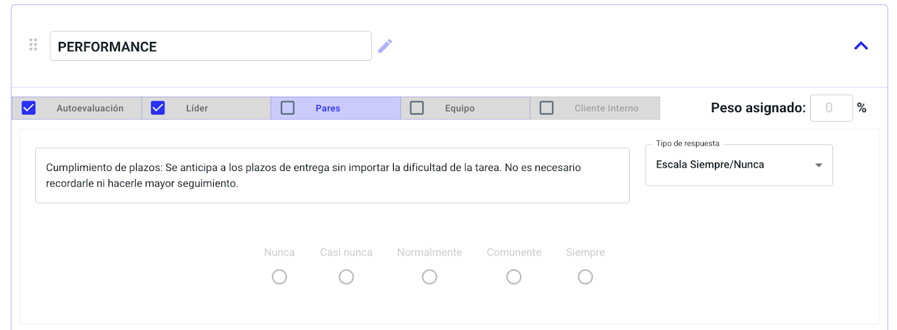 Si un stakeholder no se encuentra seleccionado como, por ejemplo, "Pares" no podrás asignar un peso y la casilla estará deshabilitada, como se muestra a continuación.