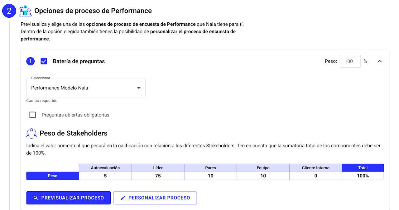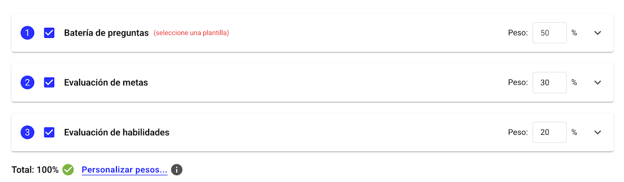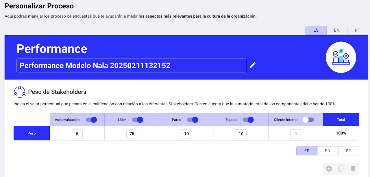Puedes distribuir los porcentajes como prefieras, activando y desactivando stakeholders y estableciendo los puntajes, incluso ss posible asociar peso 0 a la autoevavaluación.