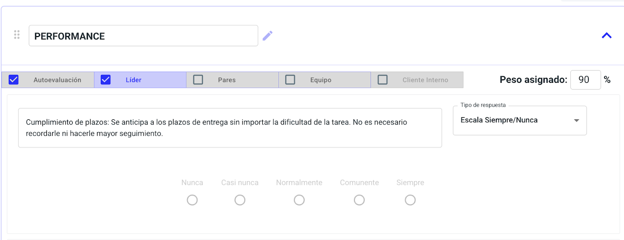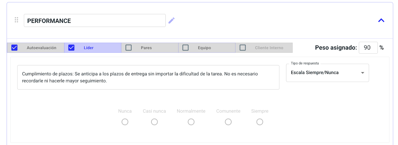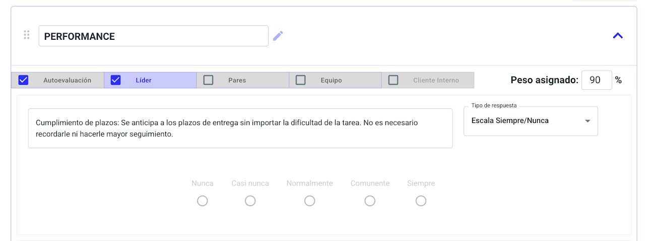 Todas las plantillas se personalizan de la misma manera, algunas de las evaluaciones tienen ciertas diferencias pero el grueso del proceso es igual. Para este paso a paso te mostraremos cómo personalizar una evaluación de performance.