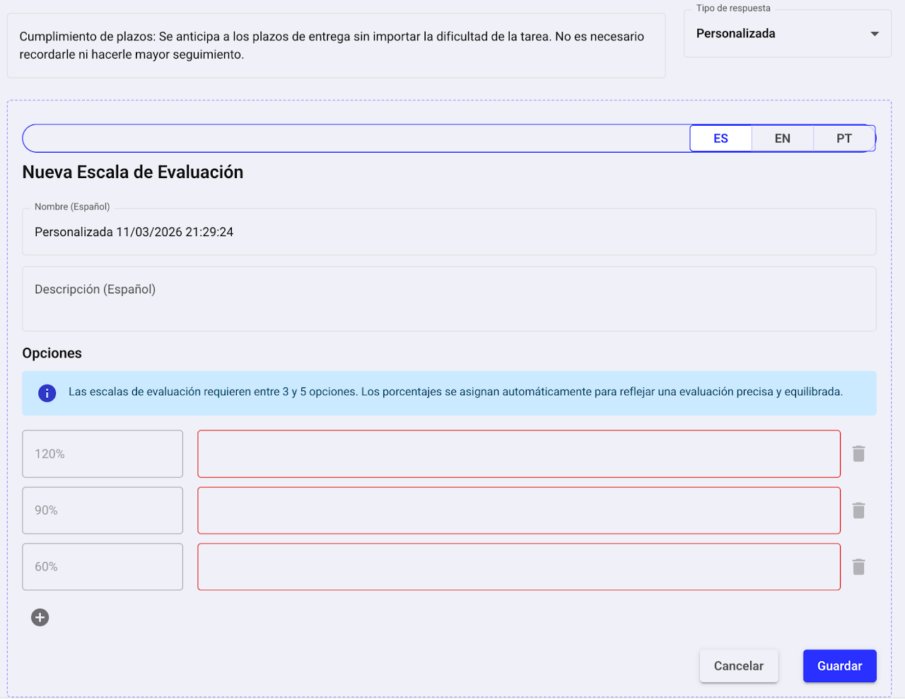 Define la escala de resultados (acorde a tu escala de respuesta). Esta será la base de los reportes individuales y del dashboard de Performance.