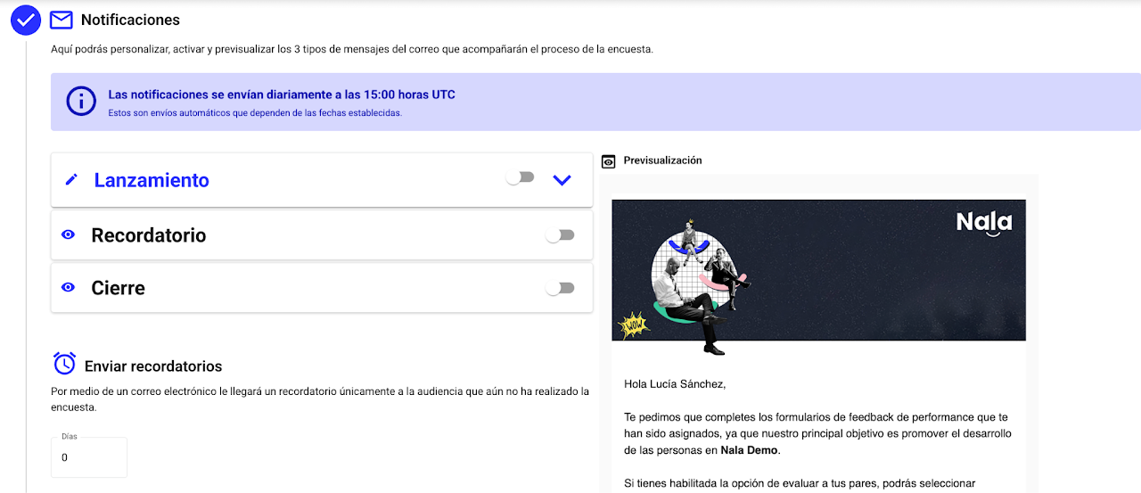Define si habrá notificaciones de lanzamiento, cierre y recordatorios automáticos.
