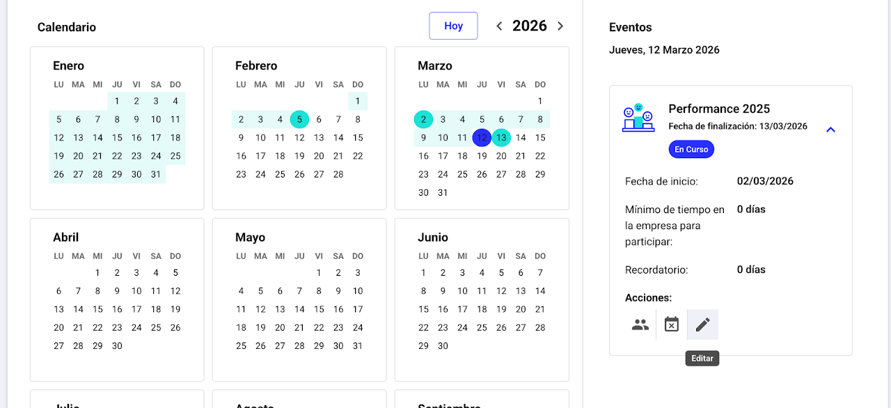 Si es un proceso programado, selecciona la fecha en el calendario. Despliega la tarjeta del proceso y haz clic en el ícono 👥 Participación.