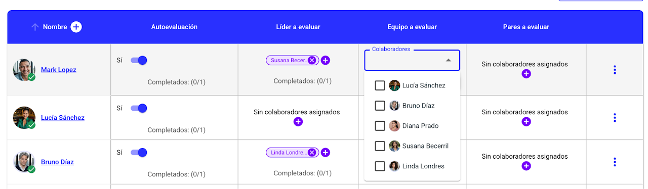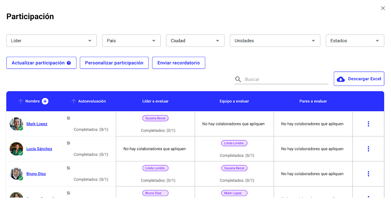 La participación en una evaluación se genera de manera automática con la información de la nómina que está en Nala y muestra quién evalúa y a quién, según el tipo de evaluación por stakeholder.