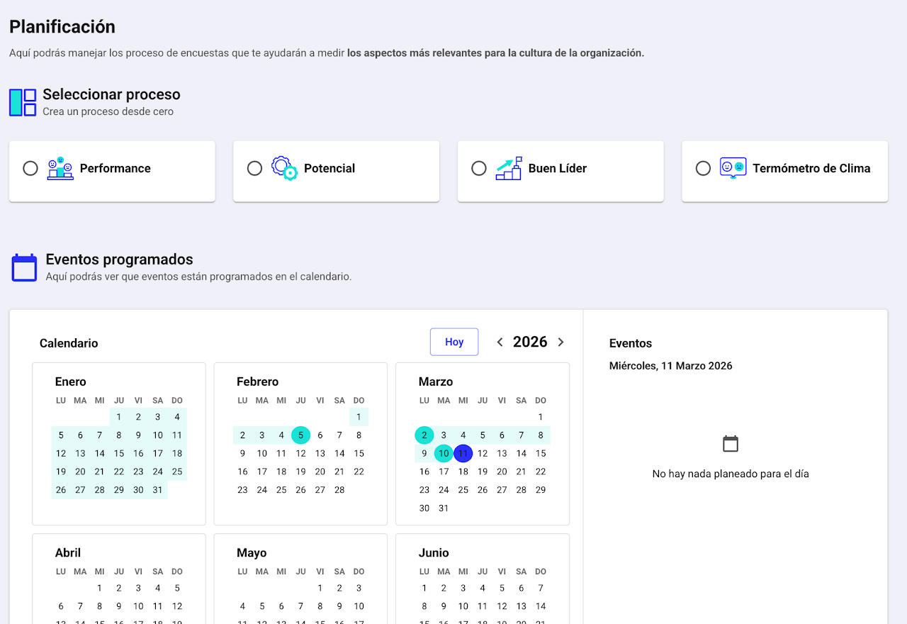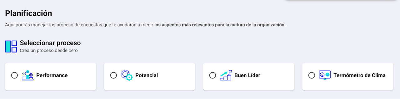 Todos los procesos son 100% personalizables, tu decides qué se pregunta y quienes responden que. Los procesos que tengas disponible para planificar estarán de acuerdo a tu rol.