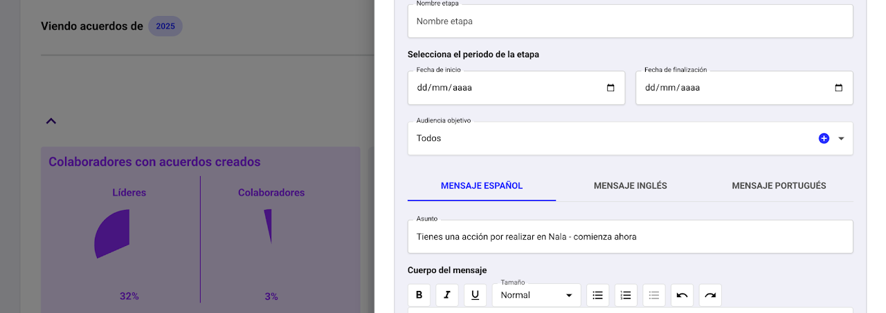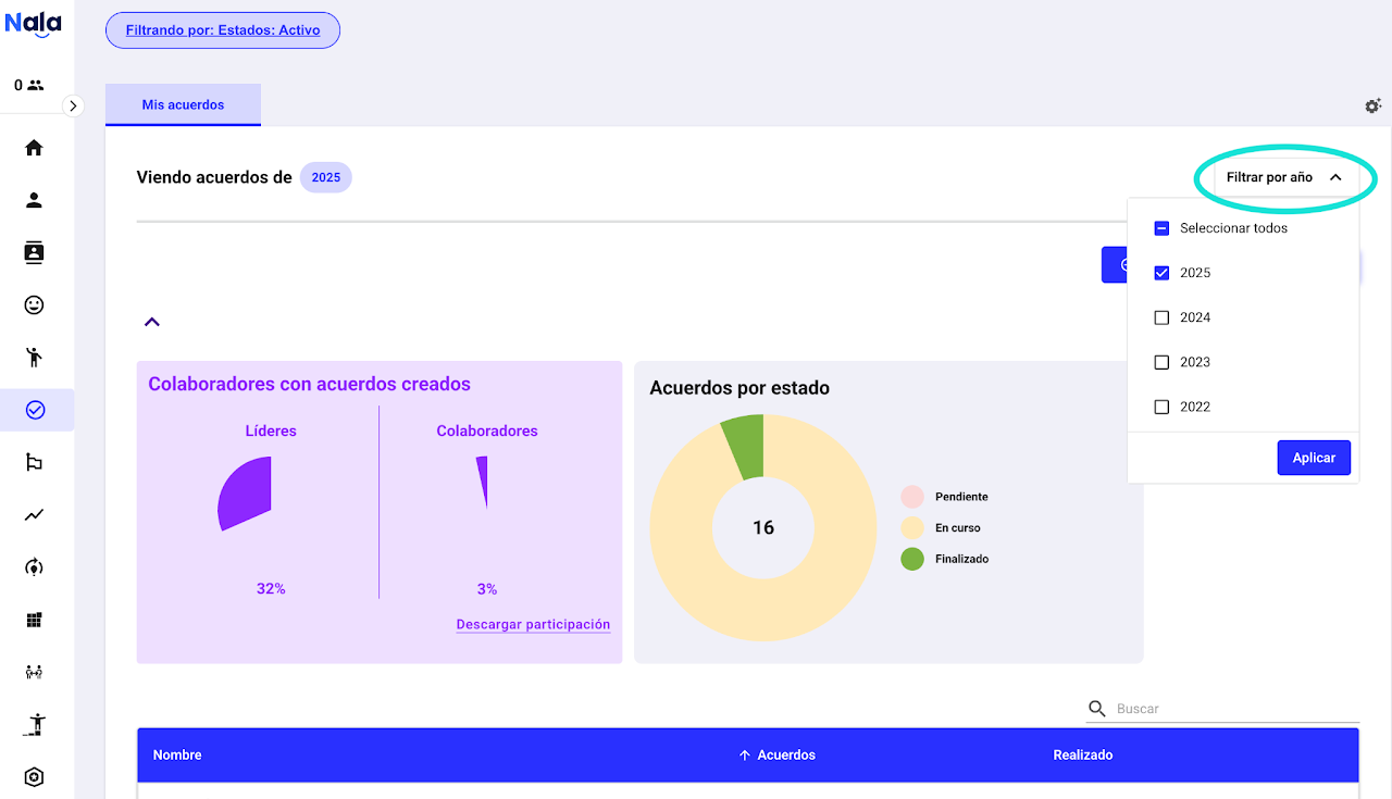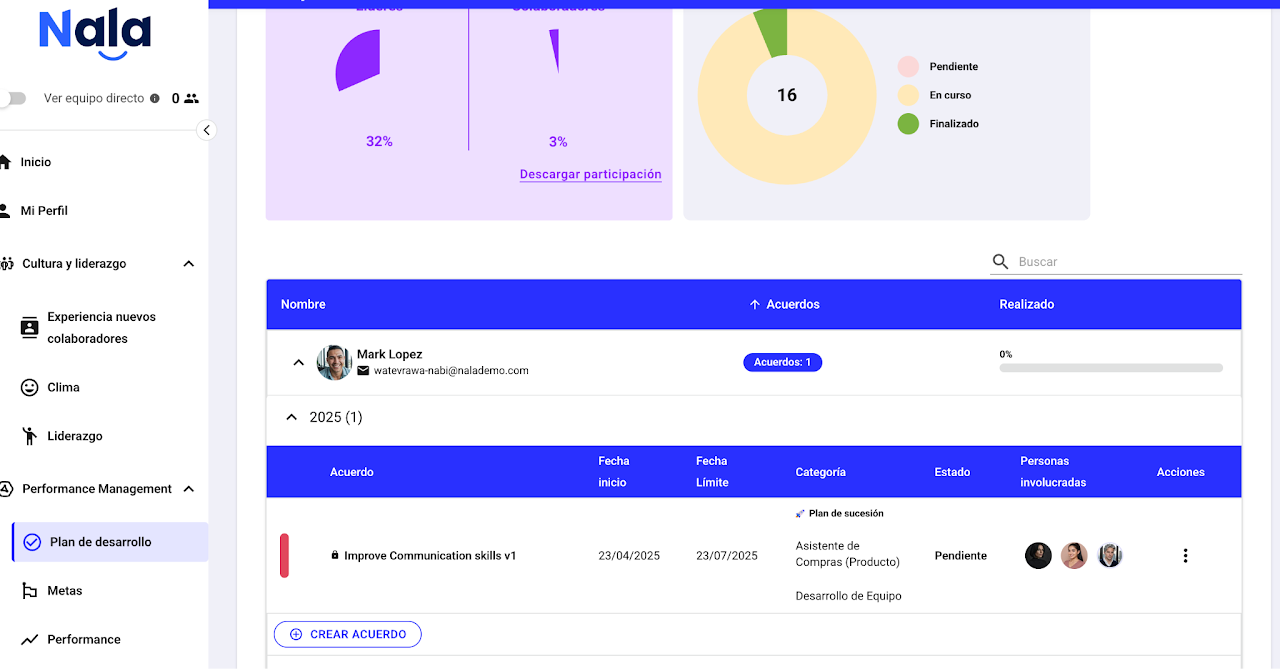 En Nala puedes crear y monitorear planes individuales de desarrollo basados en acuerdos definidos en conversaciones uno a uno entre líder y colaborador.