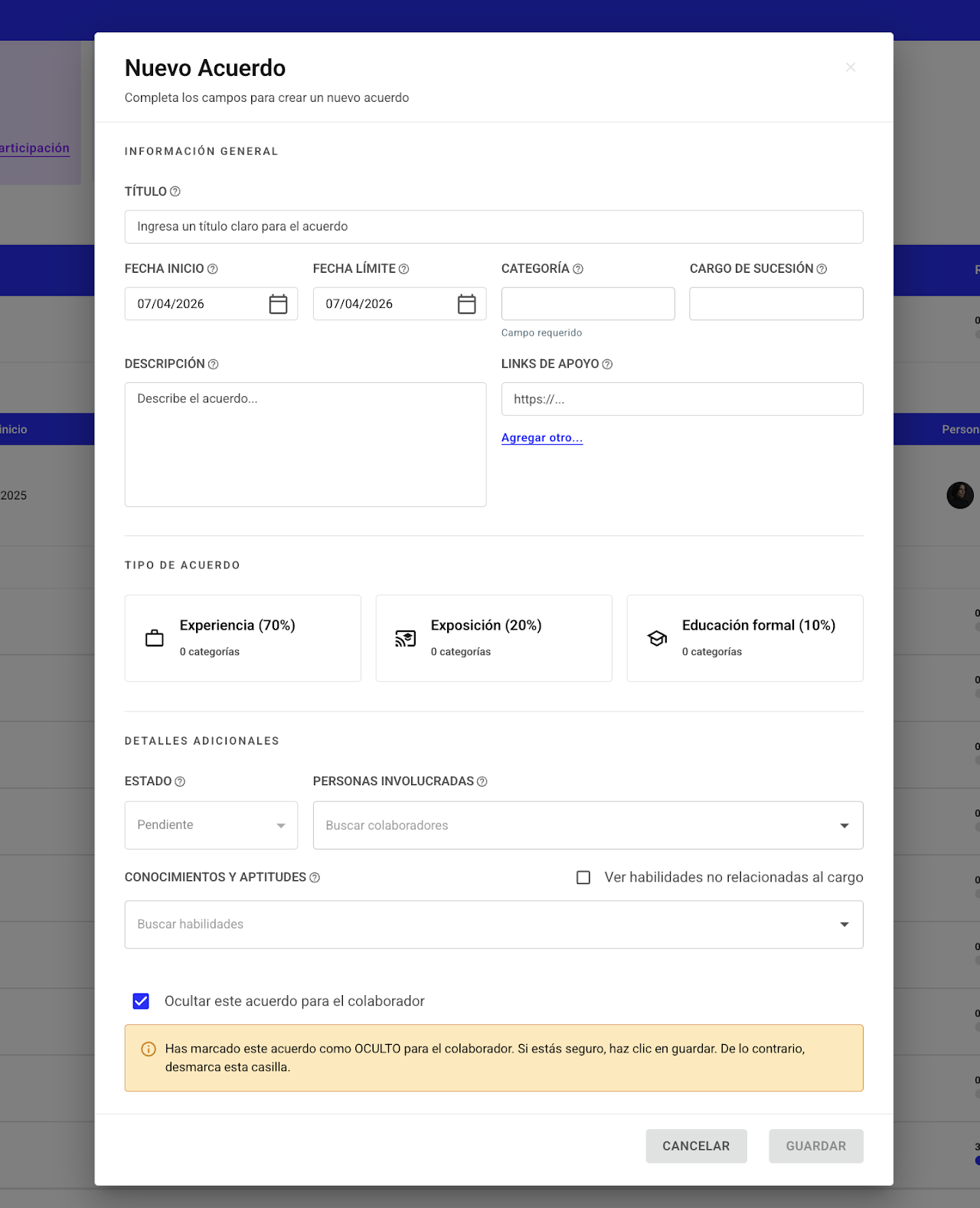 Si tu compañía tiene activa la metodología 70/20/10 deberás asociar el acuerdo al tipo de acuerdo haciendo clic sobre uno de ellas.