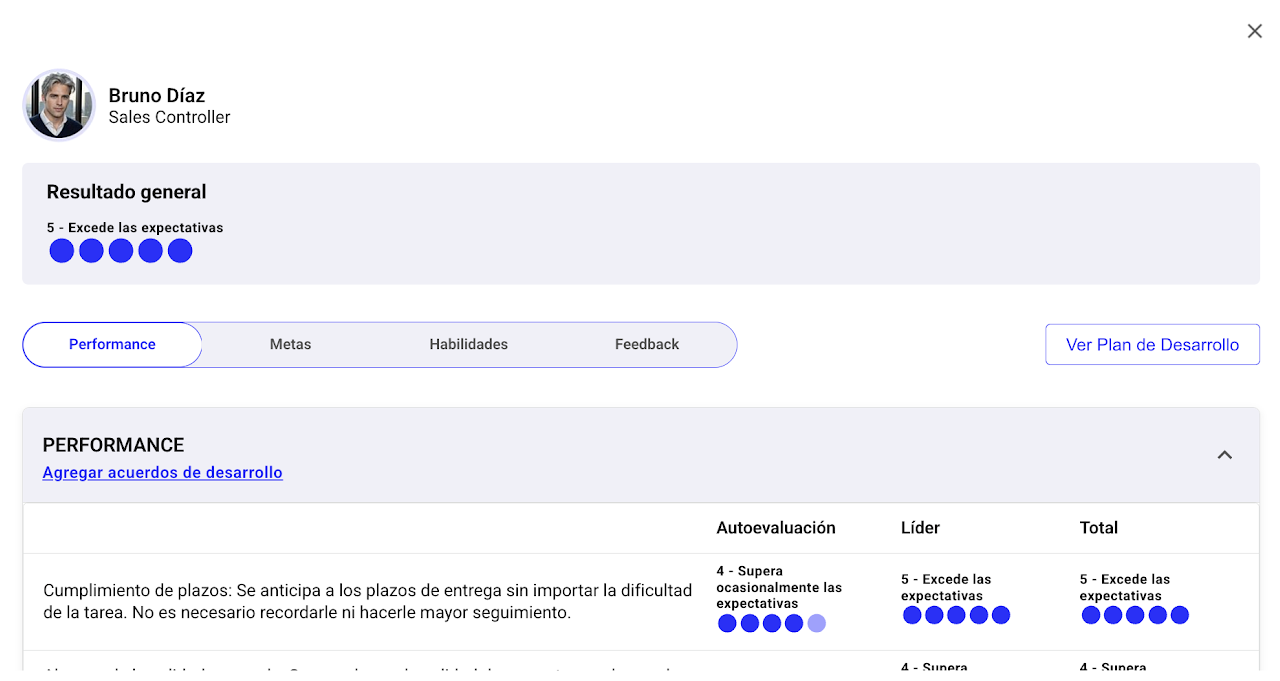 Desde ahí podrás revisar en detalle los resultados de cada colaborador, analizar el feedback recibido y entender cómo respondieron los stakeholders por cada pregunta.