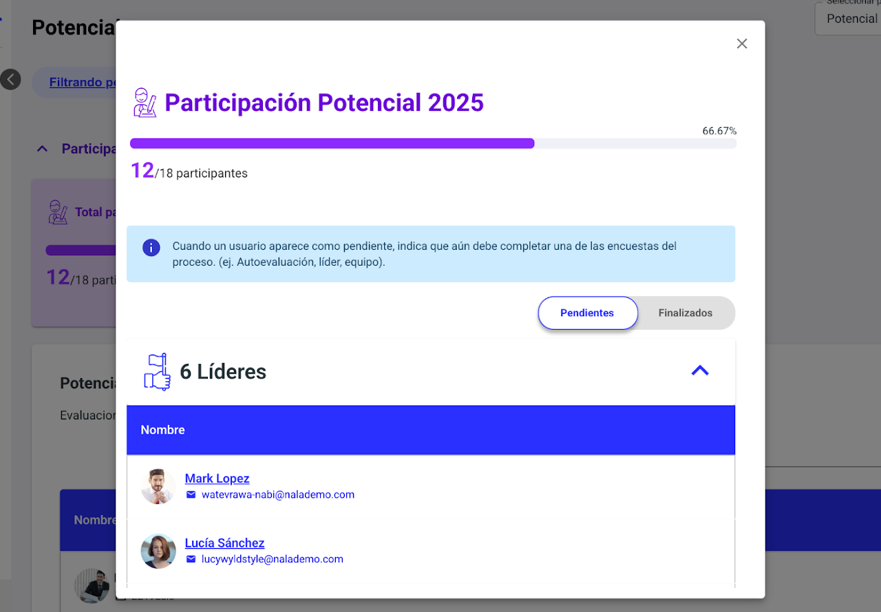 Puedes hacer seguimiento a la participación en los ciclos de Liderazgo, Potencial y Desempeño.