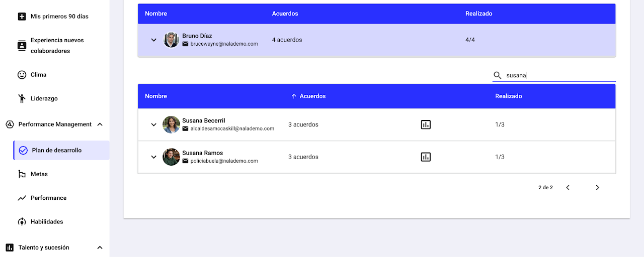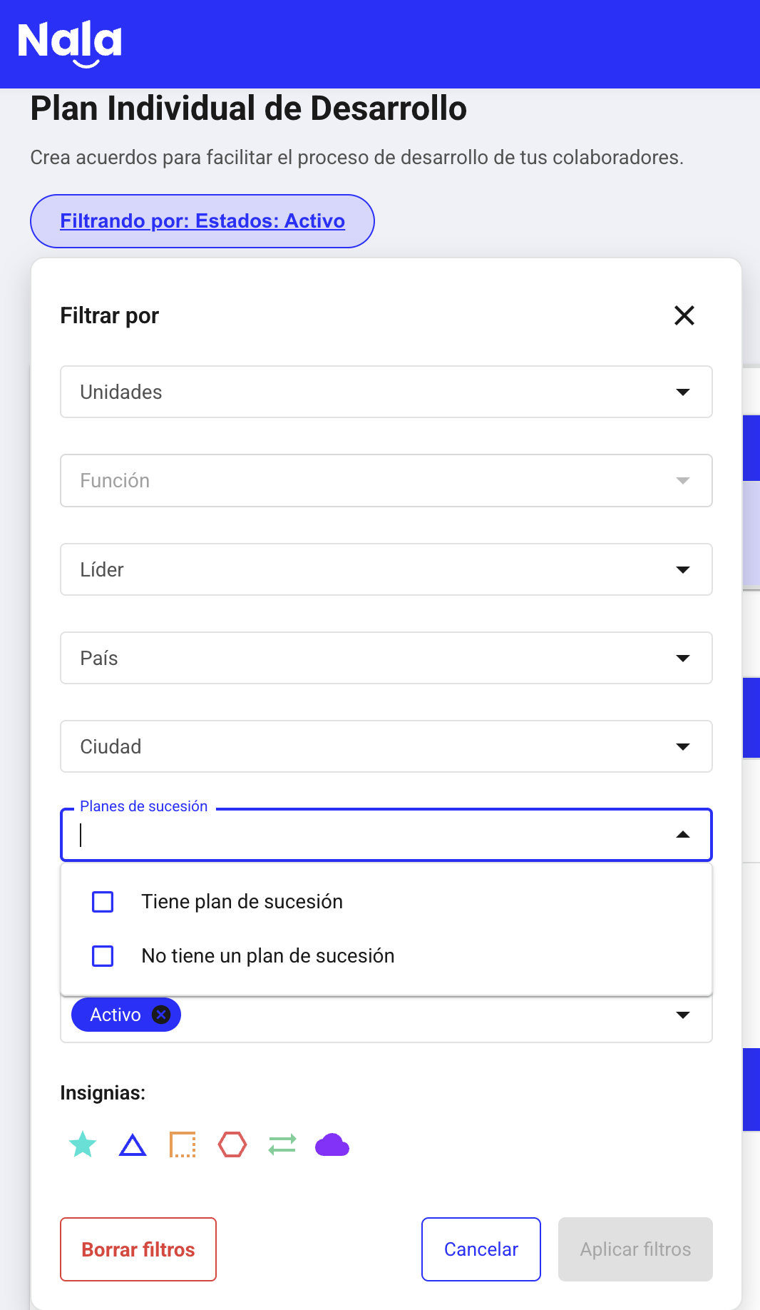 Como administrador o líder, podrás filtrar por planes de sucesión. Esto significa que están marcados como sucesores de alguna posición específica en Nala.